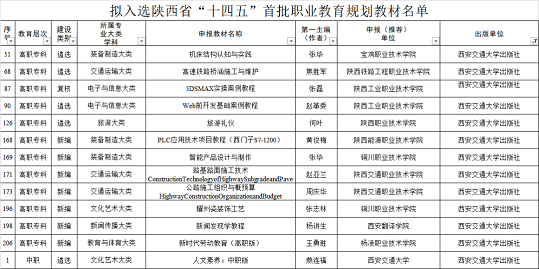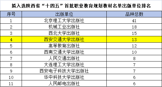 据统计,在高职本科新申报教材入选数量统计名单中,共有241家出版单位在列,其中西安交通大学出版社以13种教材位居第4。