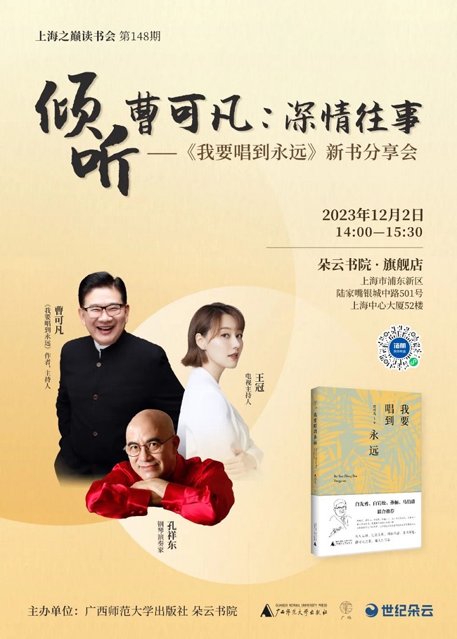 12月2日下午,我们邀请到《我要唱到永远》作者、著名主持人曹可凡,钢琴家孔祥东,主持人王冠,在上海朵云书院•旗舰店,开展一场“倾听曹可凡:深情往事——《我要唱到永远》新书分享会”,三位嘉宾将带来一场精彩而温暖的对谈,带我们一起重温故人情谊,与我们分享那些或欣喜,或感动,或传奇,或震撼的深情往事。