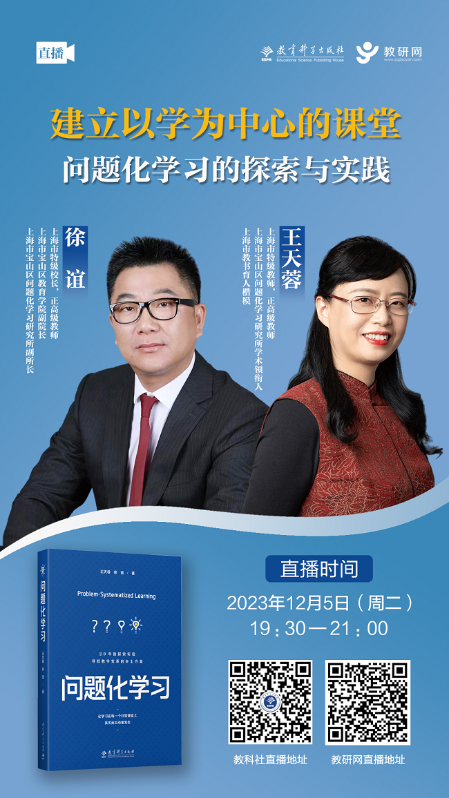 为落实新课程教学改革精神,推动课堂教学改革和创新,教育科学出版社和教研网将举办“名家·名师面对面”系列活动第28期,特别邀请上海市特级教师王天蓉、上海市特级校长徐谊为大家解读问题化学习。