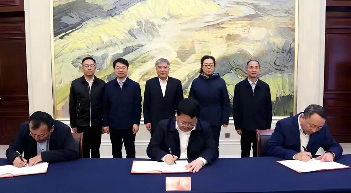 岳嵩、李占超、伊犁州教育局局长努尔巴合提·艾旦代表三方签约。