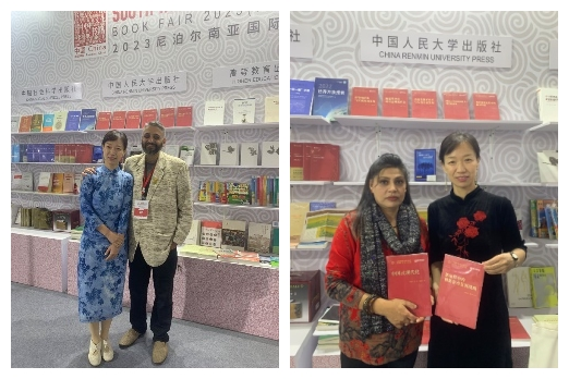 在“一带一路”倡议提出十周年之际,人大出版社发起成立的“一带一路”共建国家合作体在促进中国与沿线各国文明互鉴、民心相通发挥了重要的作用。书展期间,尼泊尔当代出版公司总裁凯兰·高塔姆、尼泊尔白莲花出版社董事长施瑞吉娜·班达丽等到访人大社展 台。两家出版社都是合作体的首批理事成员单位,在当地积极翻译出版发行中国主题图书。
