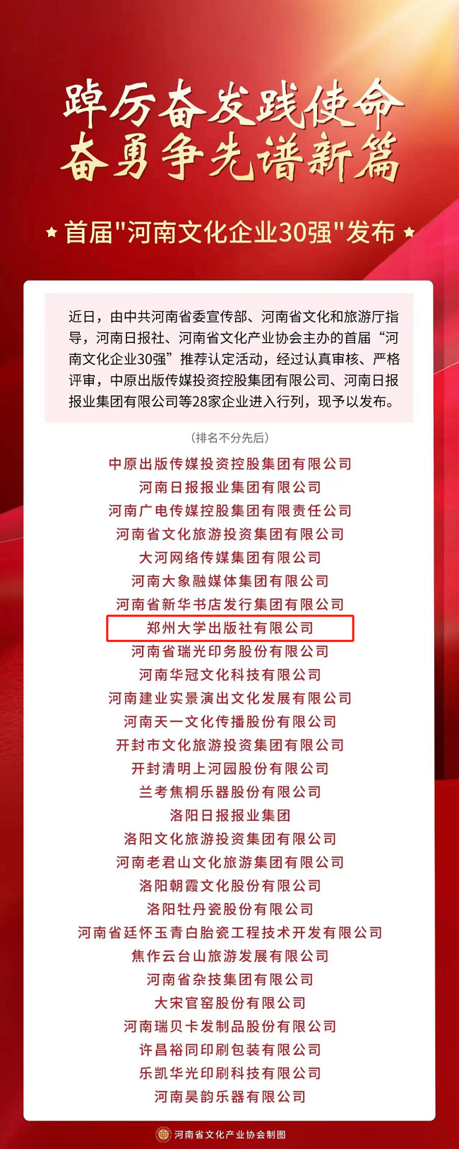 首届“河南文化企业30强”推荐认定活动由中共河南省委宣传部、河南省文化和旅游厅指导,河南日报社、河南省文化产业协会主办,旨在落实文旅文创融合战略,激发文化经营主体活力,推动文化产业高质量发展,充分展示宣传我省文化改革发展成效,发现和培育一批具有较强竞争力和影响力的骨干文化企业。经过认真审核、严格评审,郑州大学出版社等28家企业进入行列。