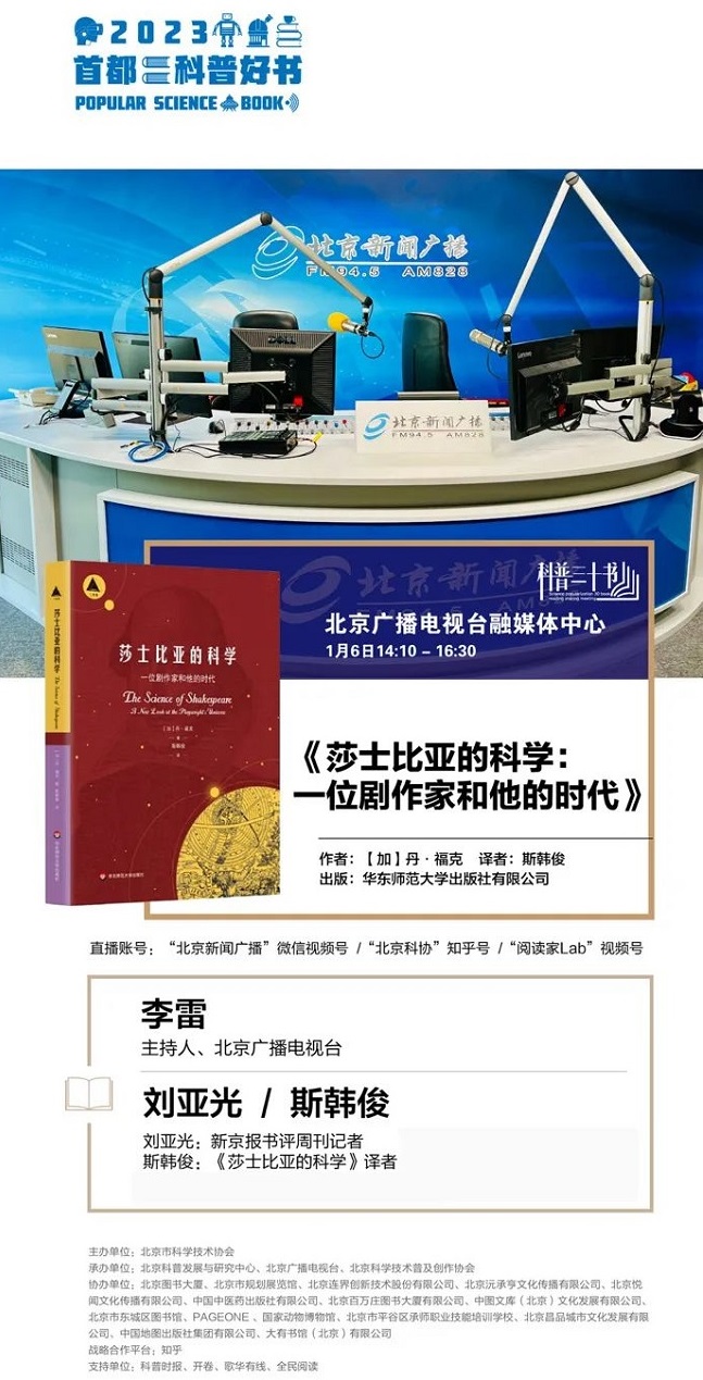 1月6日下午,《莎士比亚的科学》译者斯韩俊(连线),新京报书评周刊记者刘亚光,同北京广播电视台主持人李雷齐聚北京广播电视台融媒体中心,共同探讨“科普世界的奥秘”,将为读者带来一场酣畅淋漓的线上科普阅读分享会。