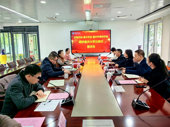 2023年12月7日上午,沙坪坝区科协主席向丽华、重庆市科普研究会理事长罗阳、重大科协秘书长周斌一行5人到重庆大学出版社开展调研并座谈交流。重庆大学出版社社长陈晓阳、党总支书记姚飞、总编辑游滨、副社长谭进等参加调研。