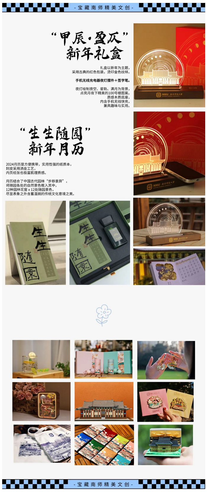 南京师范大学出版社精选了200余种经典读物、畅销好书及年度新书与大家见面。我们也带来了文化底蕴与生活美学融合创新的文创产品,2024宝藏南师新年礼盒系列将于今日首次亮相。敬请期待!