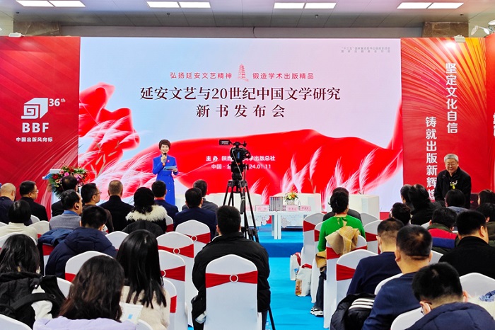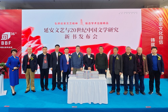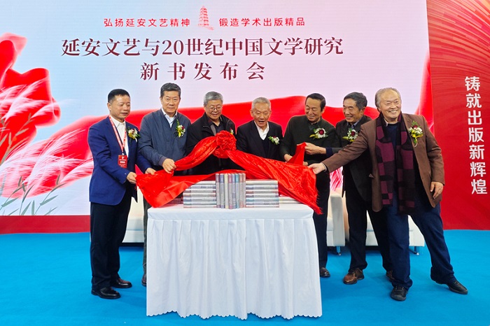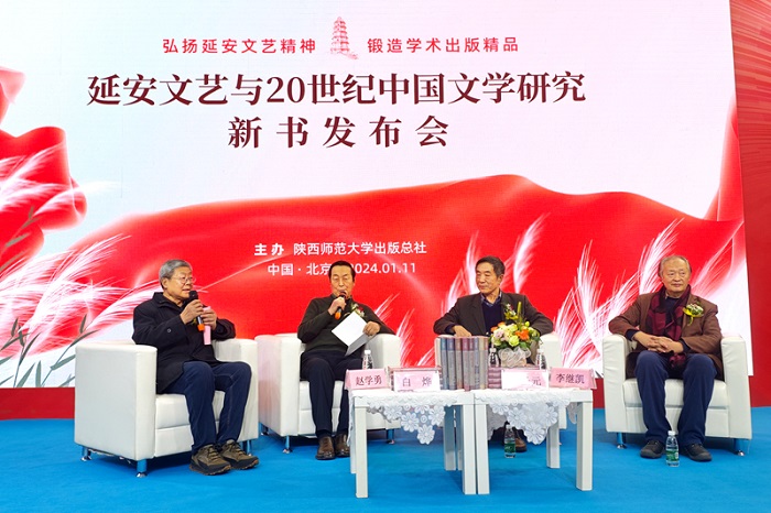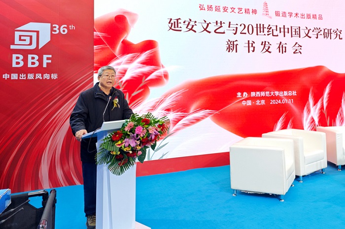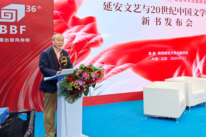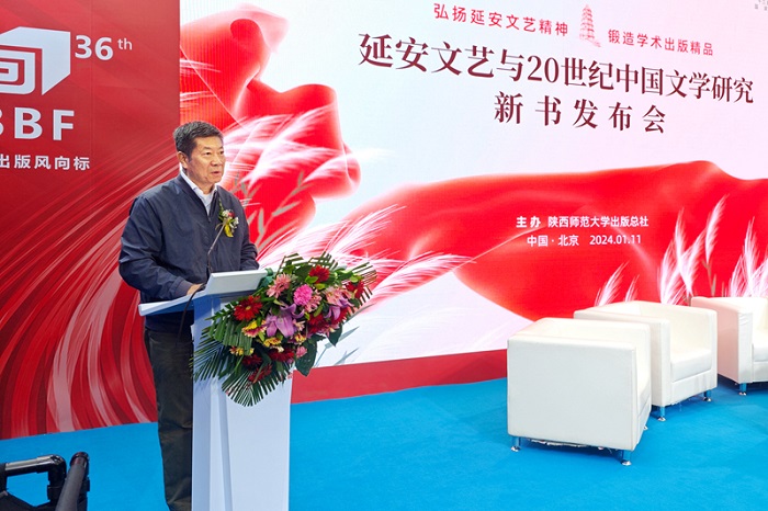 本网讯 2024年1月11日下午,由陕西师范大学出版总社主办的“延安文艺与20世纪中国文学研究”新书发布会在北京图书订货会举行。中国出版协会理事长邬书林,中国版权协会理事长阎晓宏,陕西省委宣传部副部长马川鑫,中国出版协会副理事长兼秘书长王利明、常务副秘书长吴宝安,陕西省委宣传部印刷发行与反非法反违禁处处长张涛,陕西省出版物发行协会理事长唐代伟等领导,著名文学评论家、中国当代文学研究会名誉会长白烨,著名学者、中国马列文论研究会会长党圣元,丛书主编、陕西师范大学教授赵学勇、李继凯等嘉宾出席活动。