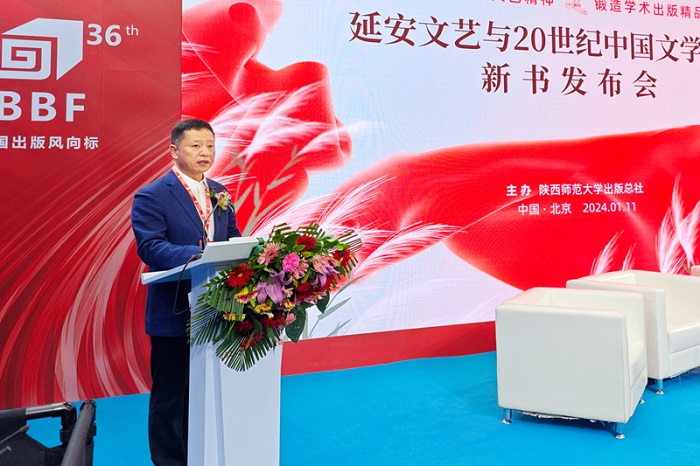 阎晓宏讲话,他指出“延安文艺与20世纪中国文学研究”丛书是陕西师大出版总社坚持源头原创、高质量发展的最新成果,既有学术分量,也有出版质量,既是学术出版的重要成果,也是主题出版、红色出版的典型代表。希望陕西师大出版总社紧紧依靠大学的学术优势、作者优势、资源优势,更好地担负起新时代出版工作新的文化使命,进一步打造出版精品,更好的服务强国建设。