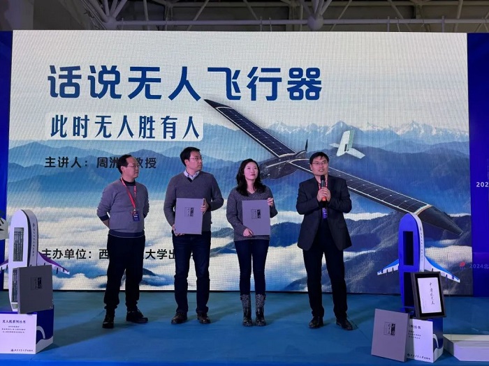本网讯 在2024北京图书订货会上,西工大出版社特别邀请西北工业大学周洲教授做题为“话说无人飞行器——此时无人胜有人”的科普报告。西北工业大学出版社社长高大力、副社长唐小林,哈尔滨工业大学出版社、哈尔滨工程大学出版社等兄弟出版社有关领导出席,北京市第十五中学100余名师生现场聆听报告会。本次活动取得圆满成功。周洲教授富有知识性、趣味性的精彩讲述赢得了在场观众的热烈反响和高度称赞。