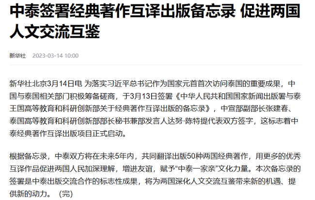 根据备忘录,中泰双方将在未来5年内,共同翻译出版50种两国经典著作。2023年8月,中国人民大学出版社被确定为中泰经典著作互译项目主承办单位。人大出版社一直积极参与亚洲经典著作互译计划,此前已经被确定为中国—吉尔吉斯斯坦经典著作互译项目主承办单位和中国—伊朗经典著作互译项目协办单位。