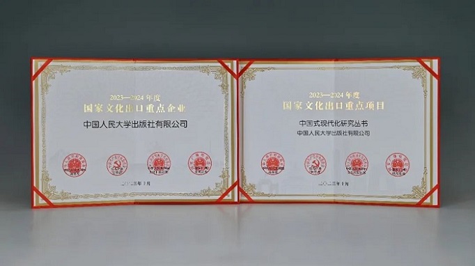 2023年10月,由商务部、中央宣传部、财政部、文化和旅游部、国家广播电视总局联合评选的“2023—2024年度国家文化出口重点企业”和“2023—2024年度国家文化出口重点项目”结果发布,中国人民大学出版社连续9届获评国家文化出口重点企业,中国人民大学出版社“中国式现代化研究丛书”入选“2023—2024年度国家文化出口重点项目”。