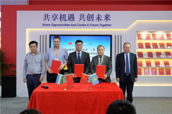 2023年6月16日,在北京国际图书博览会上,中国人民大学出版社与哈萨克斯坦欧亚—阿斯塔纳出版社、乌兹别克斯坦丝绸之路出版社共同举办“中国式现代化研究丛书”(第一辑)哈萨克文、乌兹别克文版权签约仪式。中宣部进出口管理局副局长、一级巡视员赵海云,中国人民大学副校长王轶,中国人民大学出版社党委书记、董事长李永强,中国人民大学出版社副总经理王磊,欧亚—阿斯塔纳出版社总经理阿达依·赛肯,丝绸之路出版社总经理图利亚加诺夫·欧贝克,丝绸之路出版社总编辑伊尔伽舍夫·康德,丝绸之路创信地产总经理达米尔,丝绸之路出版社董事臧红岩等出席此次会议。