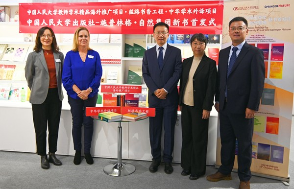 当地时间18日下午,中国人民大学出版社与施普林格·自然集团在第75届法兰克福书展召开新书首发式,联合发布了双方合作出版的20种英文版新书。中国人民大学科研处副处长关晓斌,书报资料中心党委书记李红宇,出版社副总经理郭晓明,施普林格·自然集团人文图书副主管裴米娅(Myriam Poort)和人文社科图书编辑总监、中国区图书总监李琰共同为本次首发的新书揭幕。