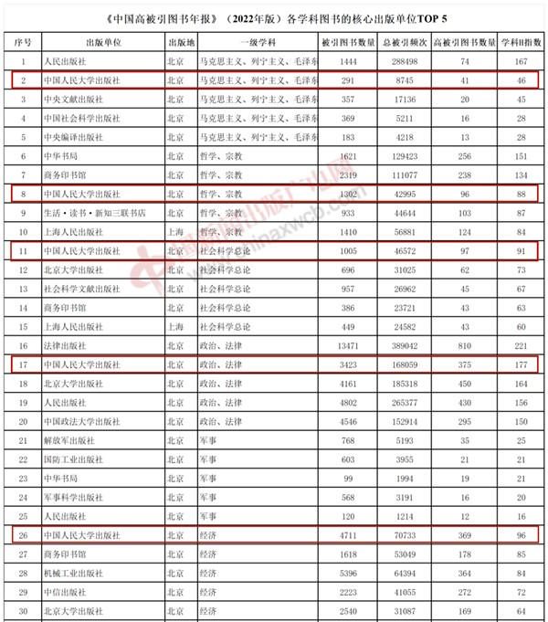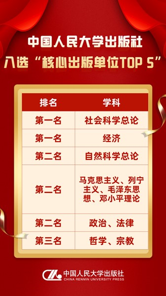 2024年1月23日,中国知网·中国科学文献计量评价研究中心发布《中国高被引图书年报》。中国人民大学出版社在六个一级学科领域被选入“核心出版单位TOP5”,高被引率彰显学术实力!
