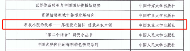 为深入学习贯彻党的二十大精神,对标对表建设社会主义教育强国,实现文化强国战略目标,进一步推动教育出版高质量发展,为建设出版强国作出更大贡献,教育部对主管出版单位的主题出版工作进行了部署。近日,教育部办公厅公示了2023年教育部主管出版单位主题出版入选选题名单。据悉,本次共计55家出版单位报送了421种选题,经评审后,最终仅69种选题入选,中国农业大学出版社选题《科技小院的故事——厚植爱农情怀 练就兴农本领》成功入选。