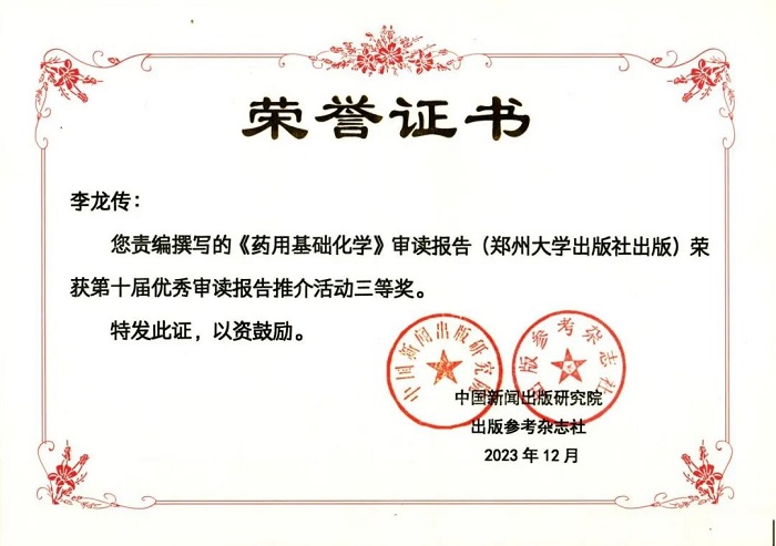 近日,由中国新闻出版研究院主办、出版参考杂志社承办的第十届优秀审读报告推介活动评审结果揭晓,共评选出48篇优秀审读报告,其中一等奖3篇、二等奖6篇、三等奖9篇、优秀奖30篇。郑州大学出版社选送的《药用基础化学》审读报告荣获三等奖。