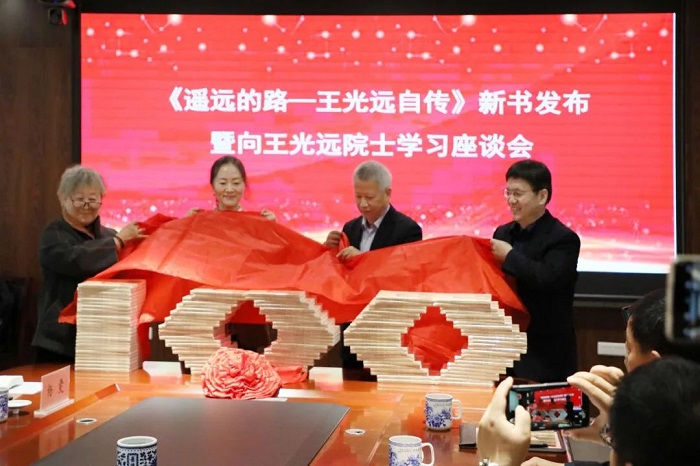 唐海英、范峰、王孟华、孙保营共同为《遥远的路——王光远自传》首发揭幕;王孟平、崔青峰、赵秋民向黑龙江省图书馆,哈尔滨工业大学图书馆、档案馆、土木工程学院,河南温县县委宣传部、王光远院士陈列馆等单位赠送《遥远的路——王光远自传》。