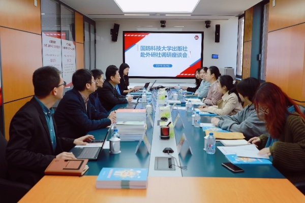 国防科技大学出版社图书编辑部主任魏云江、总编室主任周蓉,编辑马乙群、卜晓瑾、邓磊,外研社办公室主任魏国、综合语种教育出版分社社长邹皛白、副社长周朝虹、出版中心副总监马建利、编务中心总编室副主任李学鹏参加了调研座谈。