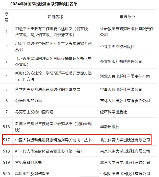 近日,由北京体育大学出版社申报的“中国人群运动促进健康精准指导关键技术丛书”成功入选2024年度国家出版基金资助项目。该丛书是近年来运动人体科学领域唯一入选国家出版基金项目的学术专著,也是北京体育大学出版社继2021年、2023年后再次获得的国家出版基金资助项目。