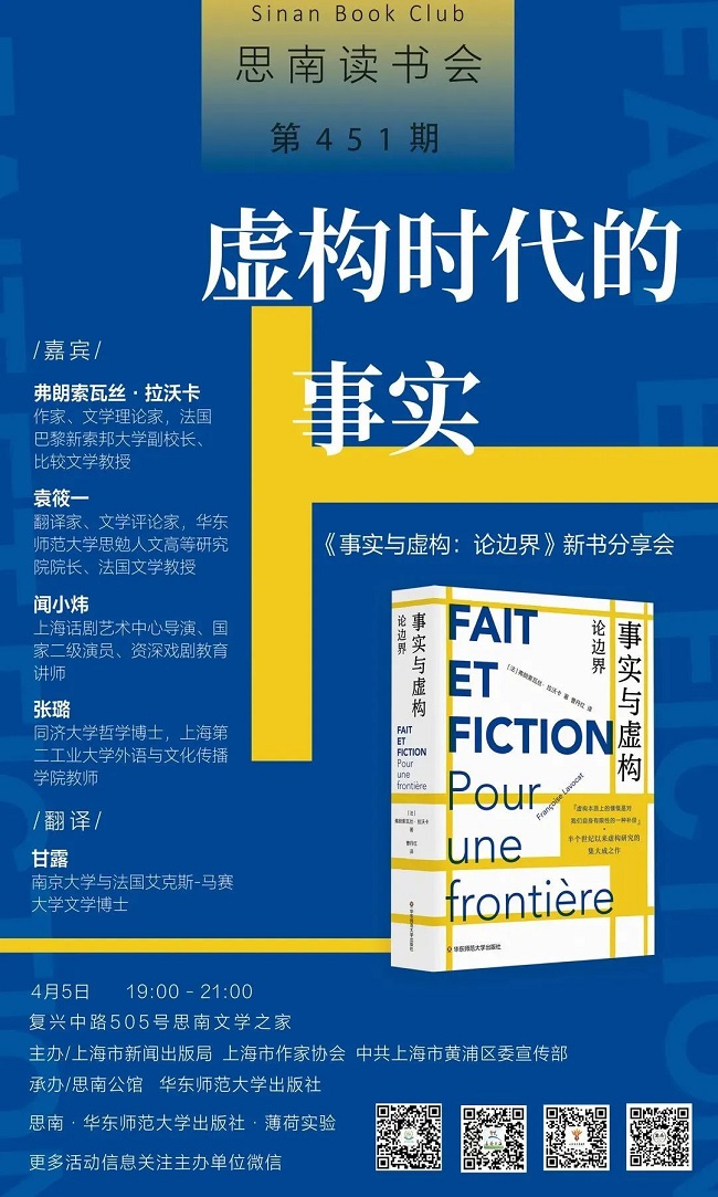 4月5日晚19:00,法国文学理论家弗朗索瓦丝·拉沃卡、华东师范大学思勉人文高等研究院院长袁筱一教授、上海话剧艺术中心导演闻小炜、上海第二工业大学外语与文化传播学院教师张璐,将做客思南文学之家,和大家共谈虚构时代的事实、事实与虚构之间的界限。