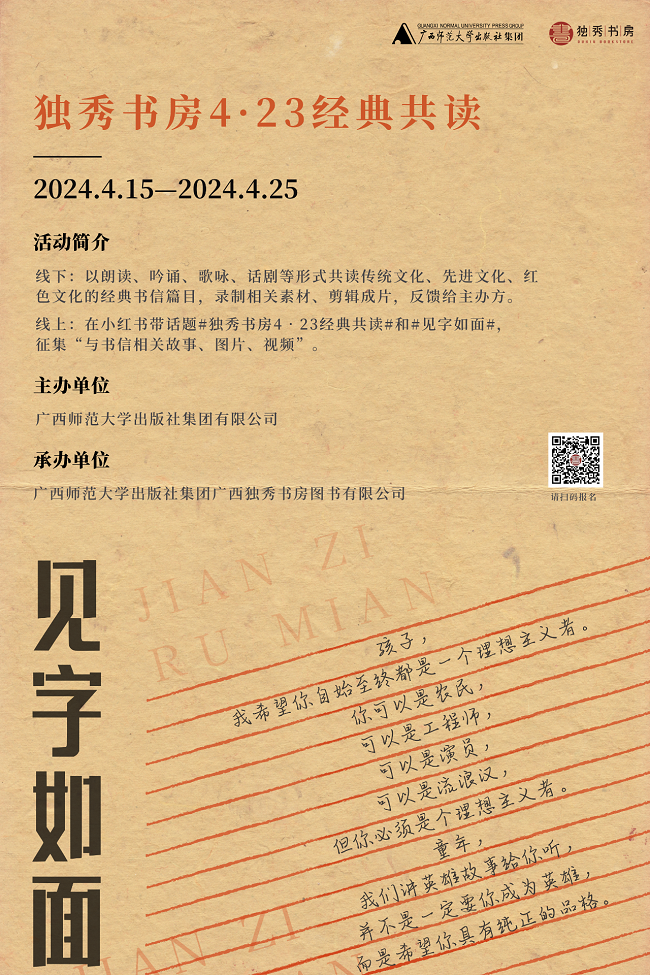 2024年,广西师范大学出版社特别策划了“‘见字如面’——4·23经典共读”阅读季主题活动,邀请更多的人跨越时空的界限,一同重温书信的魅力,感受那些历久弥新的真挚情感。