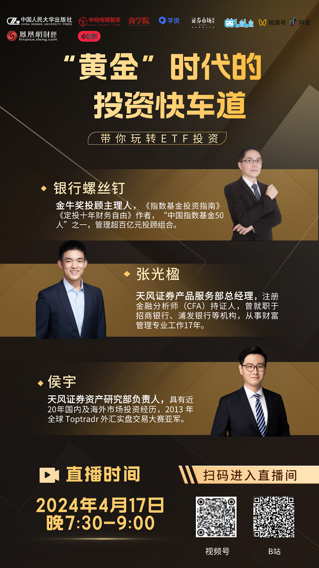 4月17日19:30-21:00,中国人民大学出版社邀请三位重量级嘉宾基于其丰富的从业经验,围绕ETF这个主题,介绍ETF产品有哪些特征和优点,解答它为什么近年来会快速发展,并提出如何基于ETF配置个人资产的建议。