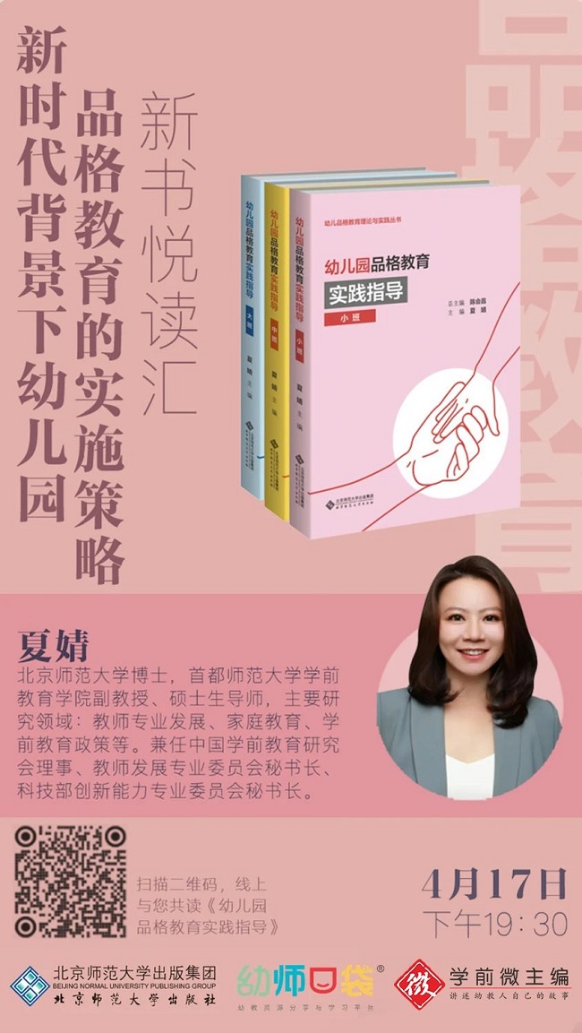 主编:夏婧,北京师范大学博士,首都师范大学学前教育学院副教授、硕士生导师,主要研究领域:教师专业发展、家庭教育、学前教育政策等。兼任中国学前教育研究会理事、教师发展专业委员会秘书长、科技部创新能力专业委员会秘书长,主持教育部、北京市社科联等课题十余项,出版专著、编著、译著10余本,发表学术论文数十篇。