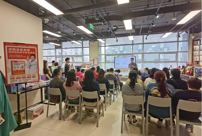 本次活动吸引了众多对身姿矫正感兴趣的小朋友及家长。冉令军老师还为现场观众讲解了家庭脊柱侧弯的检测方法,用简单的步骤帮助家长了解孩子的脊柱状况。在分享活动中,家长们通过提问与冉令军老师进行了深入交流,探讨了不良坐姿、站姿对身体的影响。