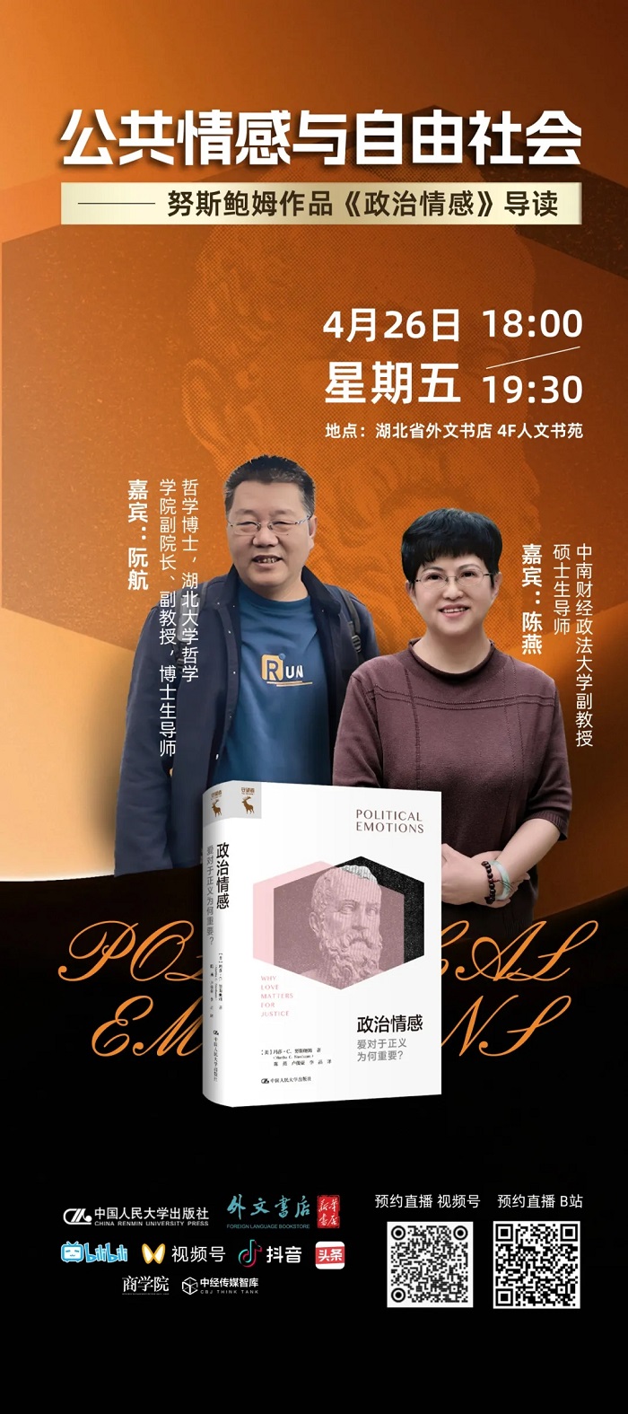 努斯鲍姆写道,“爱是赋予‘尊重人性’以生命之物”,它“使尊重人性不仅仅是一个空壳”。对于政治哲学来说,《政治情感》是一种富有挑战性而又雄心勃勃的献礼。4月26日18:00,中南财经政法大学副教授陈燕,湖北大学哲学学院副院长、副教授、博士生导师阮航,将在武汉外文书店共同探讨公共情感与自由社会。