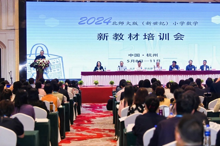 根据《义务教育课程方案(2022年版)》和《义务教育数学课程标准(2022年版)》的精神,北师大版(新世纪)小学数学教材进行了全面修订,并将于2024年秋季开始使用。为了帮助广大一线教师更好地落实课程标准要求,用好新教材,2024年5月9日至10日,北京师范大学基础教育教材编委会、北师大版(新世纪)小学数学教材编写组和北京师范大学出版集团在浙江省杭州市举办了“北师大版(新世纪)小学数学新教材培训会”。来自全国22个省(自治区、直辖市)的近650位代表现场参会,多家网络平台同步直播。