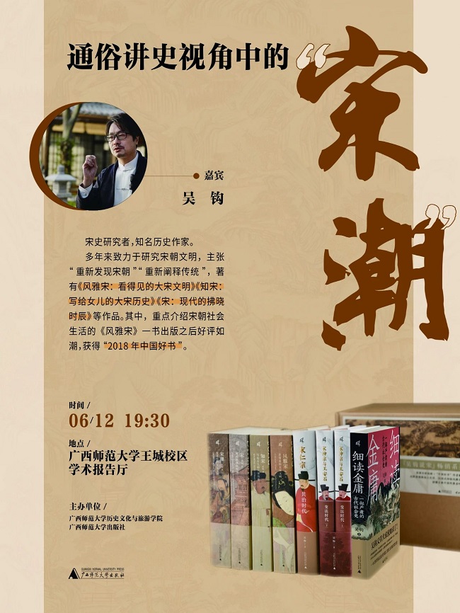 6月12日晚上19:30,著名宋史畅销书作家、《细读金庸:一部严肃的古代社会史》作者吴钩老师,将在广西师范大学王城校区学术报告厅和我们一起聊聊通俗讲史视角中的“宋潮”。让我们从这些视角中,重新发现宋朝,感受大宋文明,穿越回那个繁华的宋朝。