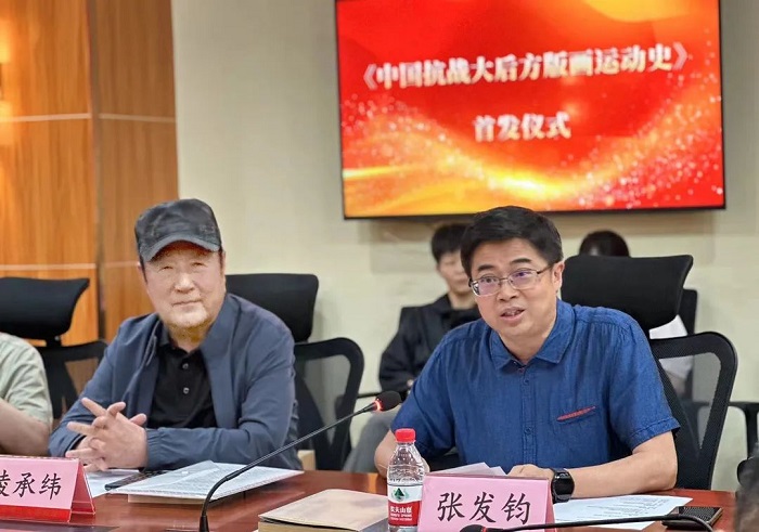 作为《中国抗战大后方版画运动史》的出版方代表,张发钧介绍了西南大学出版社发展历程、办社宗旨、特色优势,诚挚感谢各位领导、专家多年来对西南大学出版社的关心与支持。张发钧深情表示,全民族抗战时期,以重庆为中心的抗战大后方,在中共中央南方局领导下,出现了一场以抗日救亡为主旨的波澜壮阔的木刻版画运动。这场运动是抗战时期发生的一场社会影响广泛的艺术运动,它以其独特的艺术形态、丰富的思想内涵、鲜明的政治取向,以及深远的历史影响,赋予了其非凡的文化艺术价值,在中国近现代美术史上具有特殊的意义。《中国抗战大后方版画运动史》是作者凌承纬教授三十多年对抗战美术史研究成果的集大成体现,西南大学出版社能有幸得到凌承纬教授认可,承担该书出版任务,倍感荣幸与自豪。出版社美术分社编校团队不负信任,在凌教授指导和帮助下,精心打磨,终使该书如期高质量付梓出版并得以与读者见面。通过本次展览、学术论坛和新书首发,就是希望与各位专家一起,共同祝贺、见证凌教授这一精品巨著出版发行的同时,一起成为这场版画艺术运动所展现爱国主义精神的续写者,也为重庆中国抗战大后方历史文化挖掘、整理、研究与出版工程做出应有的贡献。