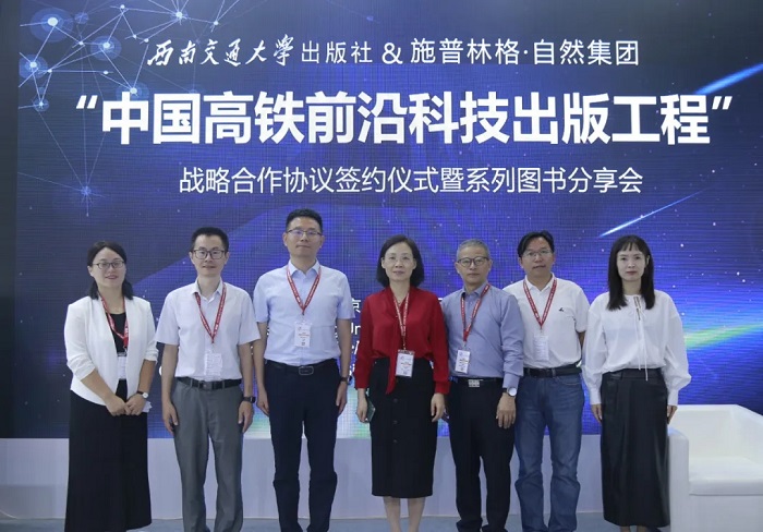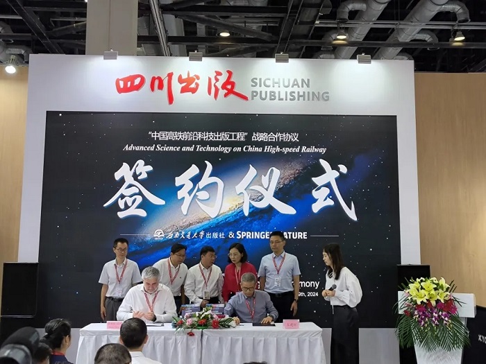 图博会开幕当天上午,西南交通大学出版社与施普林格·自然集团“中国高铁前沿科技出版工程”战略合作协议签约仪式暨系列图书分享会在四川出版展馆内隆重举行。