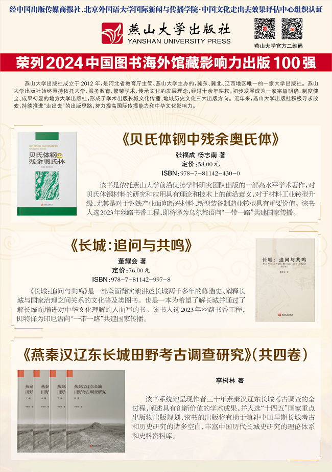 近年来,燕山大学出版社在版权输出工作中,根据自身的出版优势和特色,努力推进图书“走出去”,讲好中国故事:长城主题图书实现英文版版权输出,即将在北美出版发行;《长城:追问与共鸣》《贝氏体钢中残余奥氏体》入选2023年丝路书香工程,即将在“一带一路”共建国家传播;连续三年入选“中国图书海外馆藏影响力出版100强”,表明燕山大学出版社出版图书的思想价值和学术水平越来越被海内外读者肯定。今后,燕山大学出版社将进一步提高图书质量,着力深挖优秀传统文化,打造更多精品图书,不断探索中华优秀文化海外传播的可行性路径。