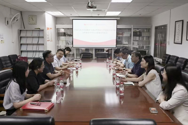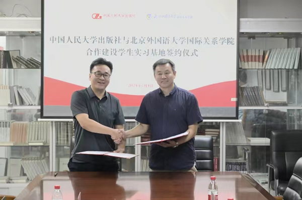 为促进产学研深度融合,加强中国人民大学出版社与高校间的人才培养合作,促进国际出版人才培养,2024年7月4日,中国人民大学出版社与北京外国语大学国际关系学院签订合作建设学生实习基地协议。