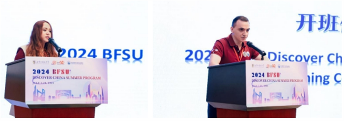 来自墨西哥的Ivonne Vargas和来自阿尔巴尼亚的Beniamin Shurdhi分别作为营员代表发言。Ivonne表示,之所以选择“发现中国”项目,是因为对中国丰富的文化、悠久的历史,以及在许多领域取得的令人难以置信的进步感到好奇。她引用“海内存知己,天涯若比邻”一句表达了对中外友谊的期待,认为通过这一项目学到的东西不仅将帮助自身成长,更有利于促使世界各国更加紧密地团结在一起。Beniamin表示,北外的每一个空间都代表着世界的一种语言或一种文化,访问北外就像在很短的时间内探索整个世界。他表达了对暑期班的热切期待,希望能够通过暑期班发现新知、探索未知、分享观点、缔结友谊。