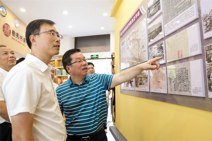 夏世飞(左)、贺祖斌(右)在历史文化墙前参观