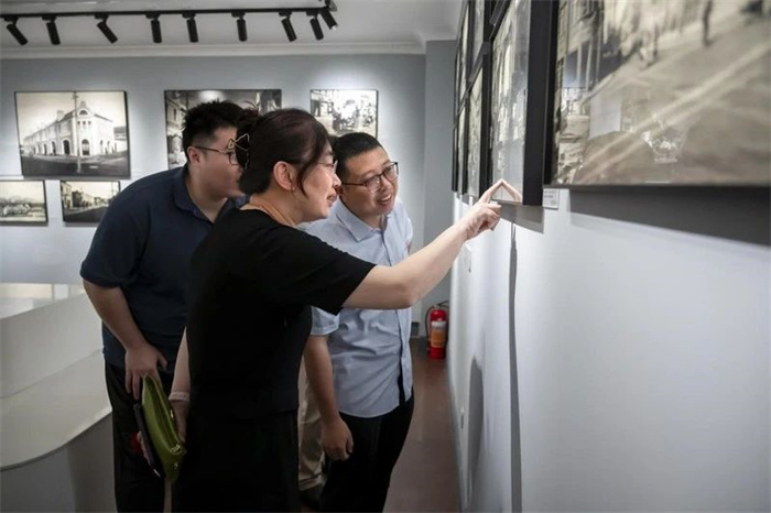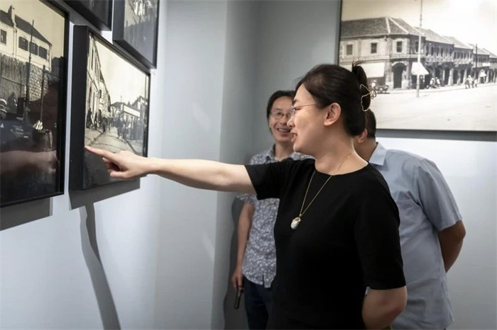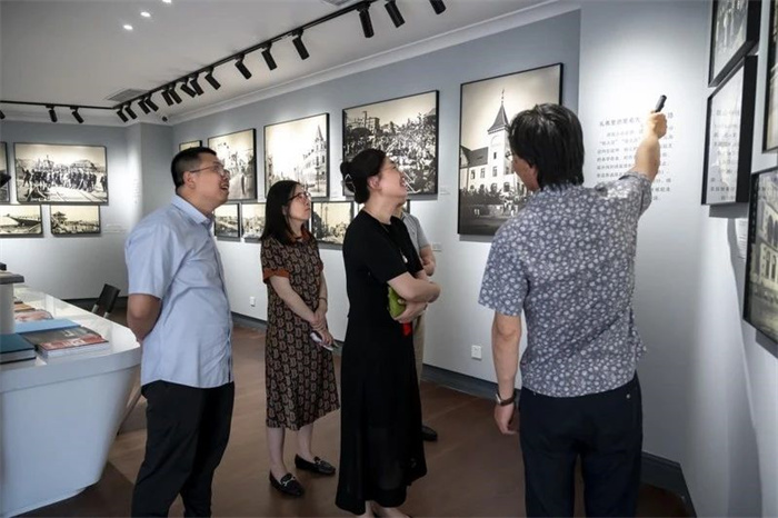 调研团队首先在青岛老照片馆常务副馆长袁宾久老师的带领和讲解下参观开馆首展——“近在眼前——青岛中山路及其周边旧影(1898—1949)”。展览展出了青岛城市初兴至青岛解放时的老照片70余张,涵盖了老青岛中山路一带建筑风貌、社会形态、历史事件、人文风情等内容。这些照片大部分为高清原版照片,建筑的砖石纹理、招牌文字,人物的喜乐表情、服饰纹样都清晰可见。这些老照片,为青岛历史建筑复原、青岛社会生活史以及中外文化交流史的研究提供了重要的参考。