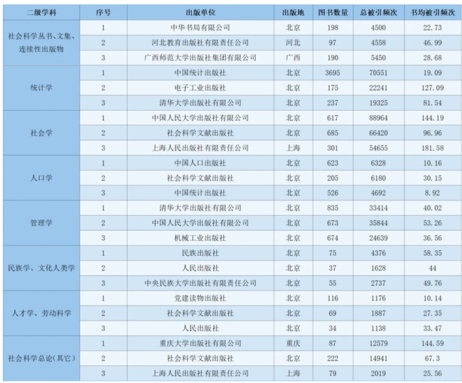 被引频次可以较为客观地说明各出版单位出版的图书总体被使用和重视的程度,以及在学术交流中的作用和地位。在社会科学总论的二级学科下,重庆大学出版社在社会科学总论(其它)领域出版图书87本,书均被引频次最高,达144.59,体现了其在该领域的专业性和出版能力。