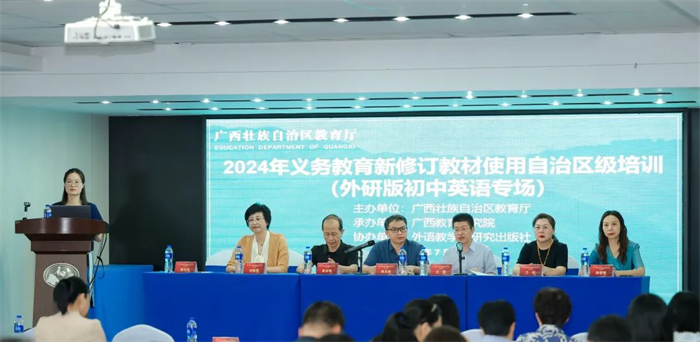 为深入贯彻落实《教育部关于印发义务教育课程方案和课程标准(2022年版)的通知》(教材〔2022〕2号)精神,助推新课标新教材落地实施,帮助广西壮族自治区一线教师把握新教材内容,理解新教材特色,落实课程标准要求,将课标理念转化为教学实际,2024年7月16日,由广西壮族自治区教育厅主办、广西教育研究院承办、外语教学与研究出版社(以下简称“外研社”)协办的“2024年广西义务教育新修订教材使用自治区级培训(外研版初中英语专场)”在南宁顺利开班。来自南宁、桂林、柳州共三个地市的初中英语教研员及骨干教师近100人参加本次培训。