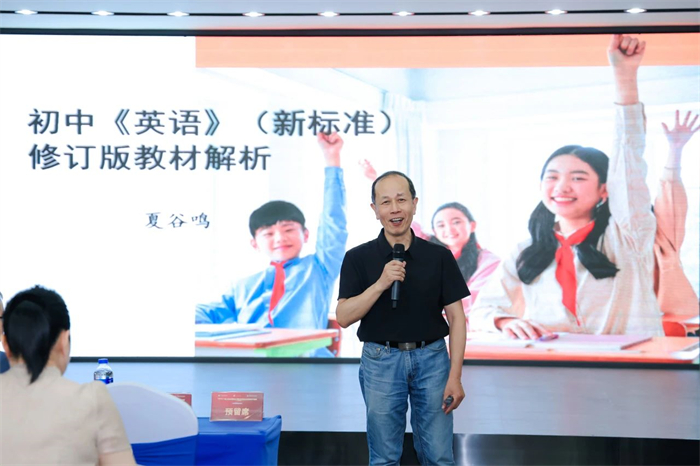 国家基础教育课程教材专家工作委员会委员、《英语》(新标准)初中修订版教材副主编夏谷鸣老师进行了题为“落实新课标理念,用好新标准教材”主题发言。他强调,教师不仅要教授学生语言知识与技能,也要提升学生的整体英文素养。他向参会教师明确了新课标要求,详细说明了新教材如何落实课标理念,带领学生在英语课堂中提升对自我的认识、对社会的认识、对自然的认识。夏老师细致剖析了教材的编写理念、单元结构、活动设计及主要特色,为教师们使用新教材提供了详尽的指导和建议。