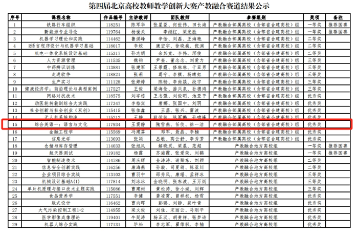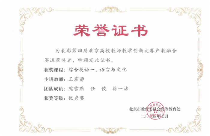 2024年6月,北京市教育委员会公布第四届北京高校教师教学创新大赛获奖名单,外语教学与研究出版社(以下简称外研社)、北京外研在线数字科技有限公司(以下简称外研在线)支持中国地质大学(北京)外国语学院英语教研室主任王震静主讲的“综合英语一:语言与文化”课程获得产教融合赛道优秀奖。