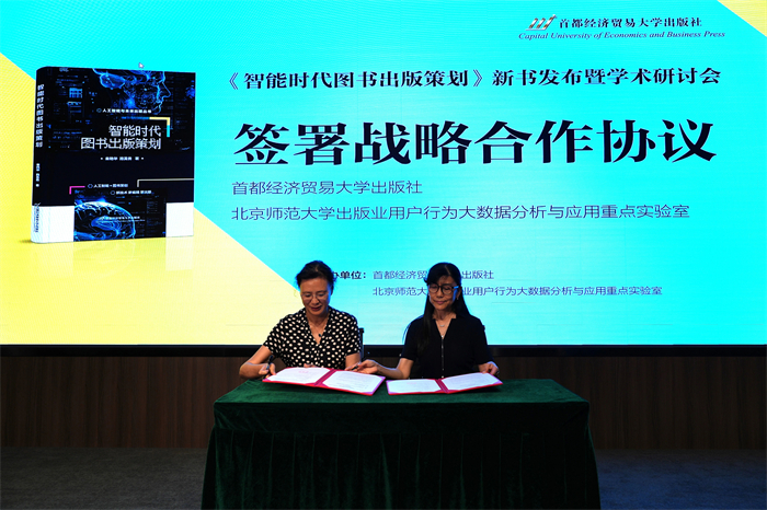 会议最后,首都经济贸易大学出版社与北京师范大学出版业用户行为大数据分析与应用重点实验室签订战略合作协议。双方就加强校企合作、促进产研结合、加快人工智能等新技术的应用,在人工智能辅助教学、教育资源建设及研发合作,专家指导和咨询服务,出版人才培养、融合出版实践教学和实习基地建设,媒体融合和数字出版前沿研究及成果出版, 人工智能安全、知识版权保护的研究和实践等方面开展深度合作,共同推动出版融合不断升级。