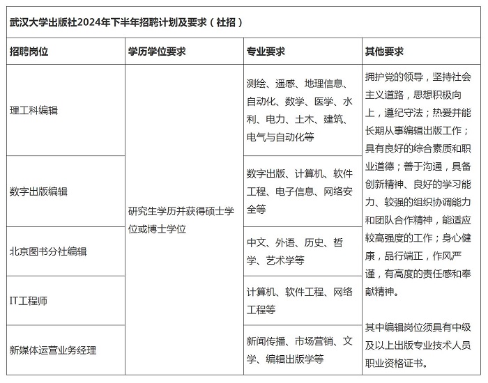附件:武汉大学出版社2024年下半年招聘计划及要求(社招)