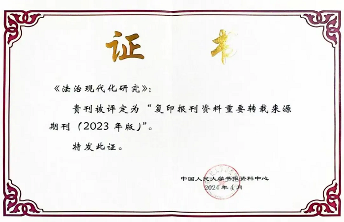 《法治现代化研究》将以入选“复印报刊资料重要转载来源期刊”为契机,深入贯彻落实习近平法治思想,认真贯彻落实中办、国办《关于加强新时代法学教育和法学理论研究的意见》,推出更多有思想、有温度、有品质的精品力作,持续提升办刊质量和学术影响力,为新征程上推进和拓展中国式法治现代化,推动建构中国自主的法学知识体系贡献智慧和力量!