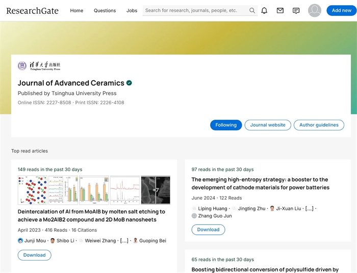 目前,5种期刊主页已在ResearchGate正式上线,向用户提供包括所有文章页面、期刊目标和范围、期刊指标、编委会信息等丰富信息。此外,作者在这些期刊上发表的文章将自动添加到他们的ResearchGate个人主页中,便于他们分享研究成果,获取阅读和引用信息,从而加强与科研圈的互动。