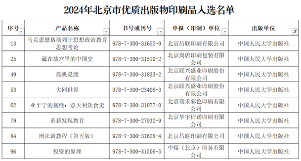 近日,在北京市新闻出版局揭晓的2024年100种优质出版物印刷品评定名单中,中国人民大学出版社有8种图书入选,成为本年度评定中入选数量最多的出版社,再次彰显中国人民大学出版社在图书质量方面的不懈追求。