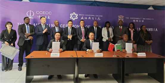 在赞比亚政、校、企、行各方的共同见证下,赞比亚铜带大学校长伊玛西库·尼亚姆、威海职业学院书记李耀华、中国土木工程(赞比亚)有限公司副总经理罗自兵代表三方代表共同签订了《“赞比亚—班·墨学院”建设合作备忘录》,并完成了“赞比亚—班·墨学院”在赞正式挂牌。