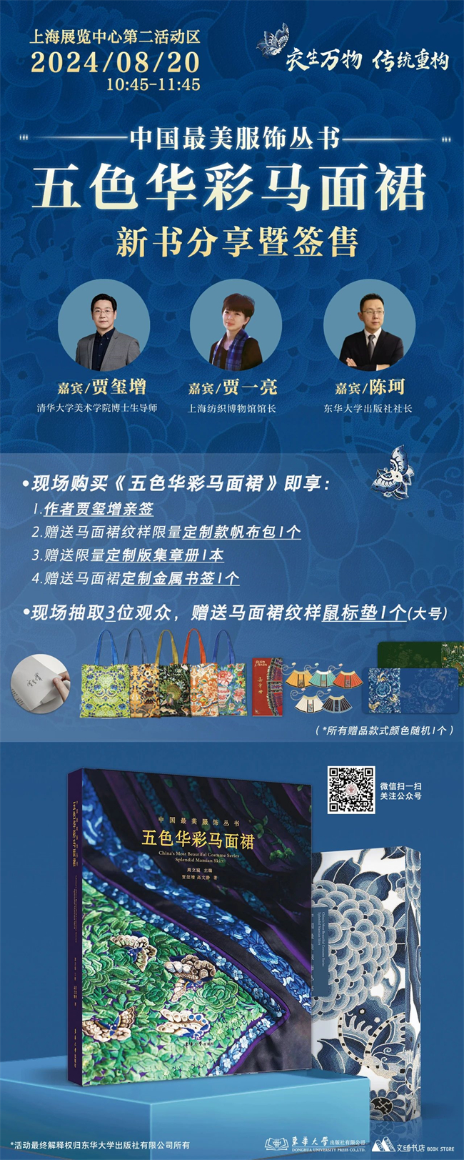 ·现场购买新书《中国最美服饰丛书——五色华彩马面裙》即可获赠马面裙纹样帆布袋1个和集章本1本(集章本限量10本/天)。