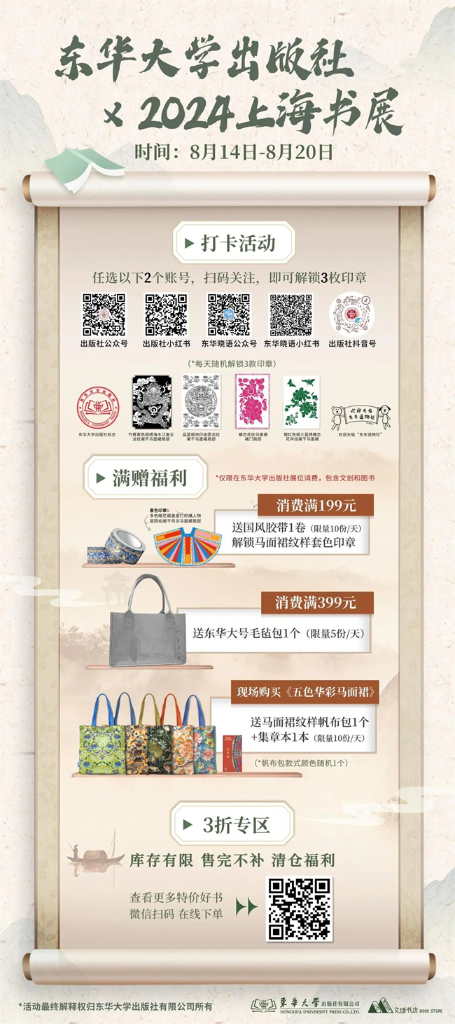 书展期间,东华大学出版社将于8月15日、18日下午14:00为大家带来“云逛书展”好书特惠专场直播,直播间享专属好价,还有大额优惠券等你来拿!