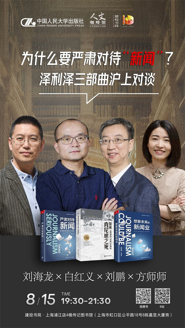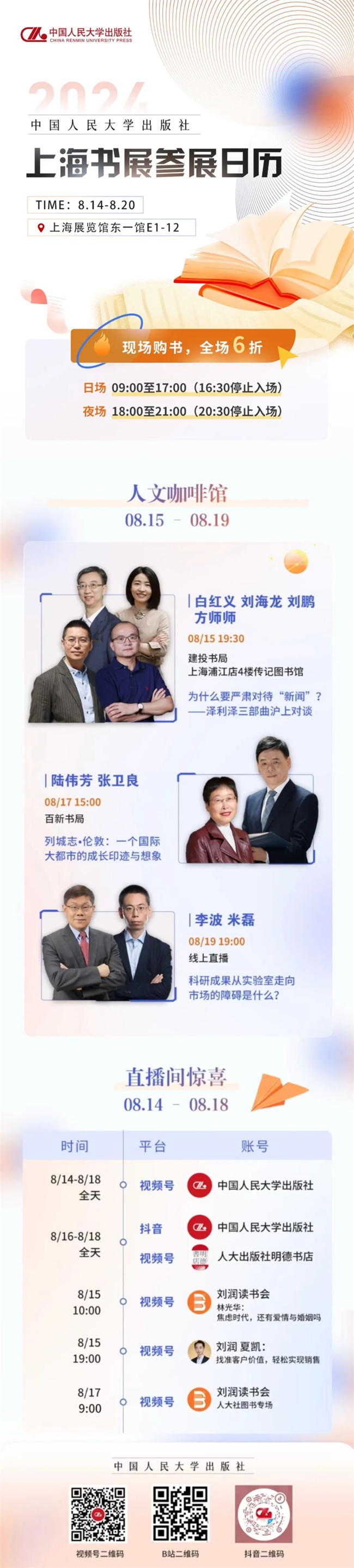 本次书展中国人民大学出版社邀请出版社作者、知识文化领域名家对话,解析大众热点、畅聊时代议题,推出3场重磅活动,前两场分别在建投书局·上海浦江店4楼传记图书馆、百新书局与观众见面,并进行同步直播。